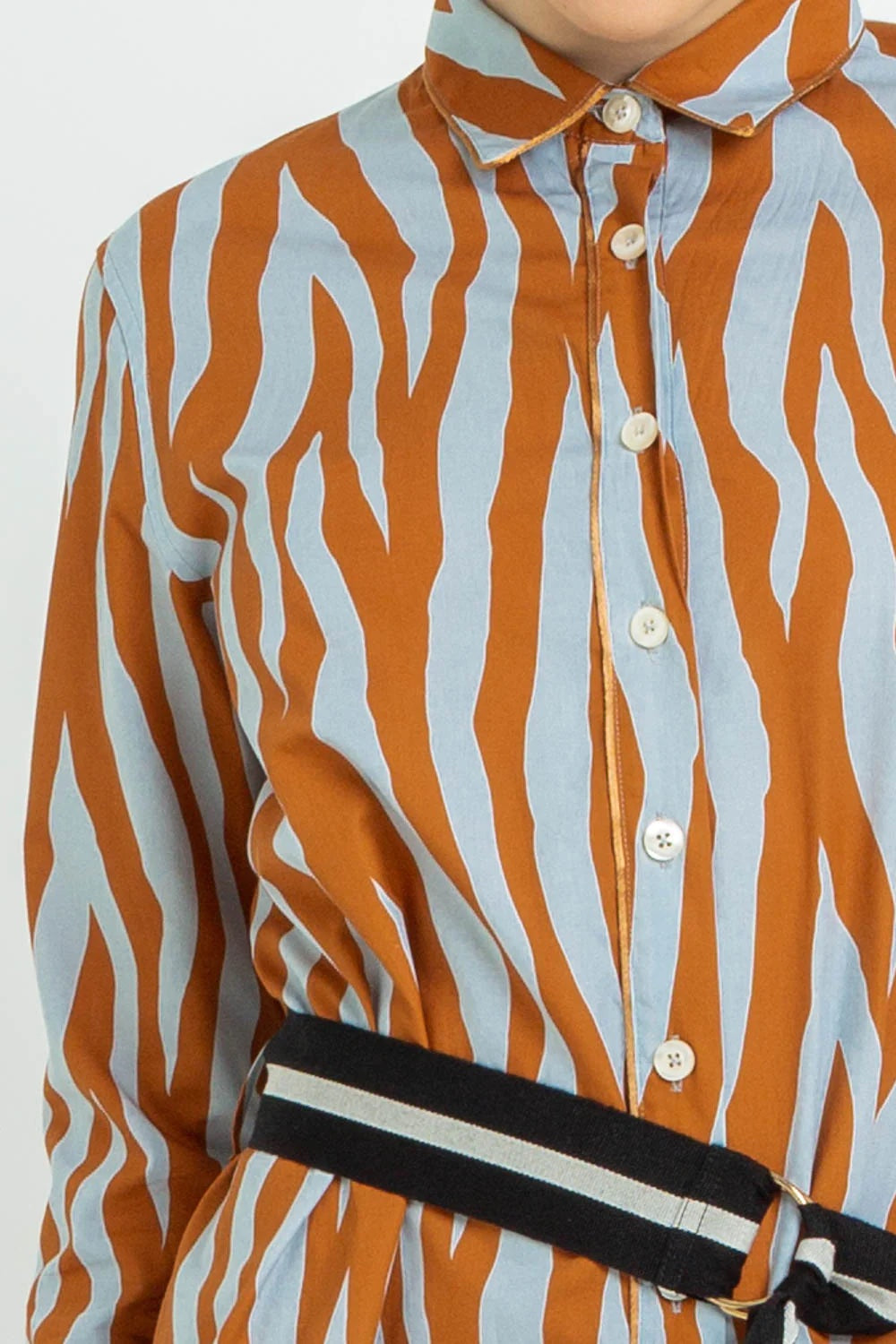 Robe chemisier à motifs avec ceinture amovible de couleur contrastante. Détails sur les profils, col classique, fermeture boutonnée sur le devant et logo imprimé au dos. Coupe régulière