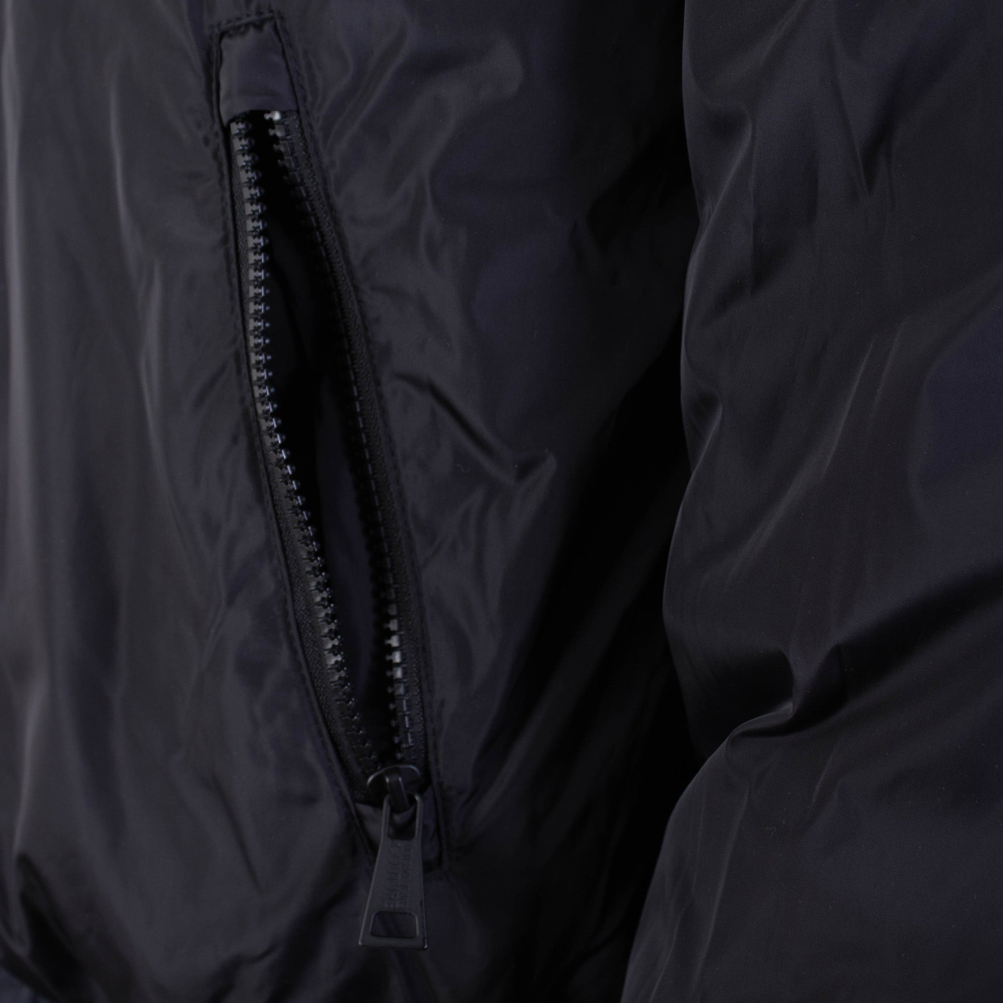 Model:  Quilted jacket for men with Baroque printed all over, reversible jacket, two side pockets, detachable hood. B Side. Black with white logo on the back